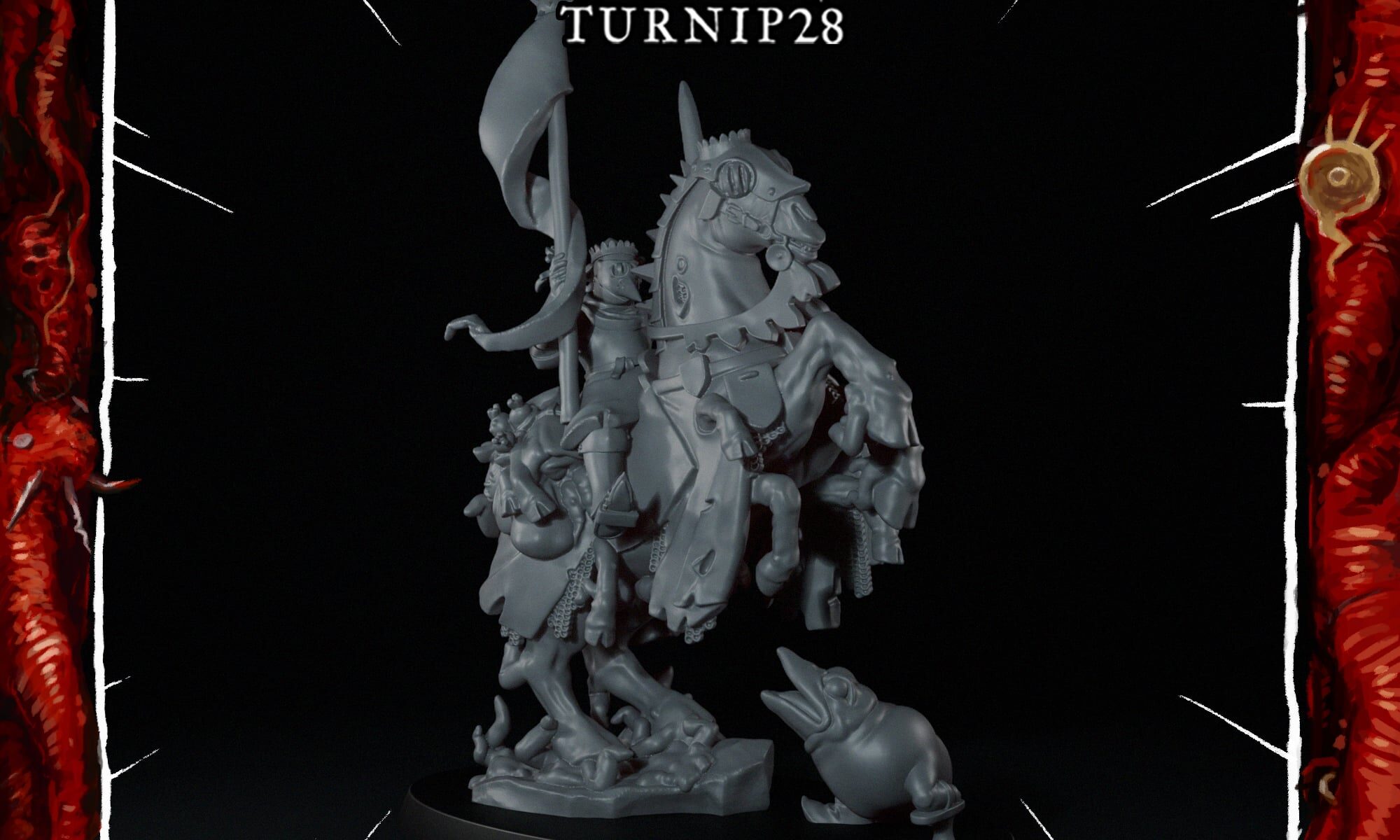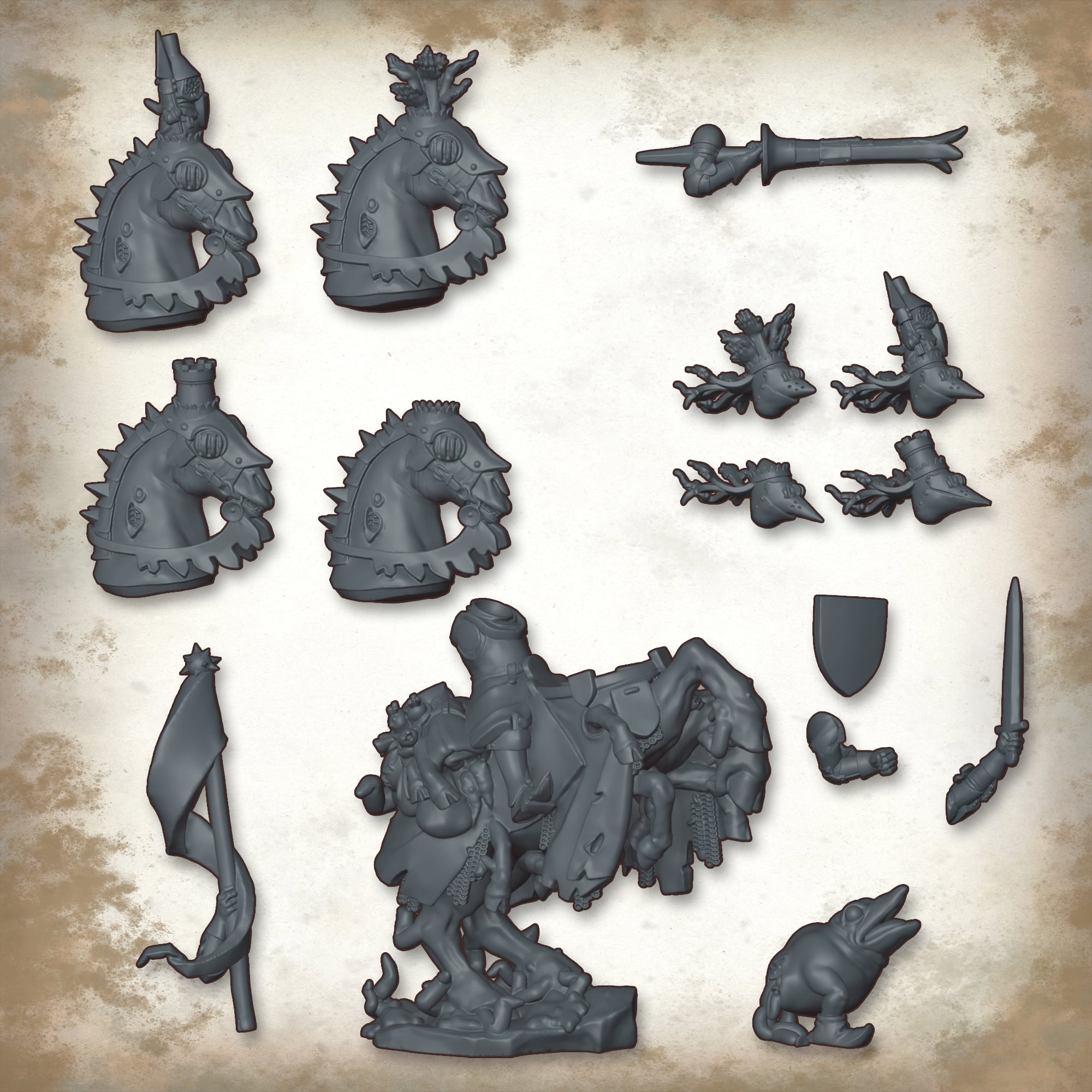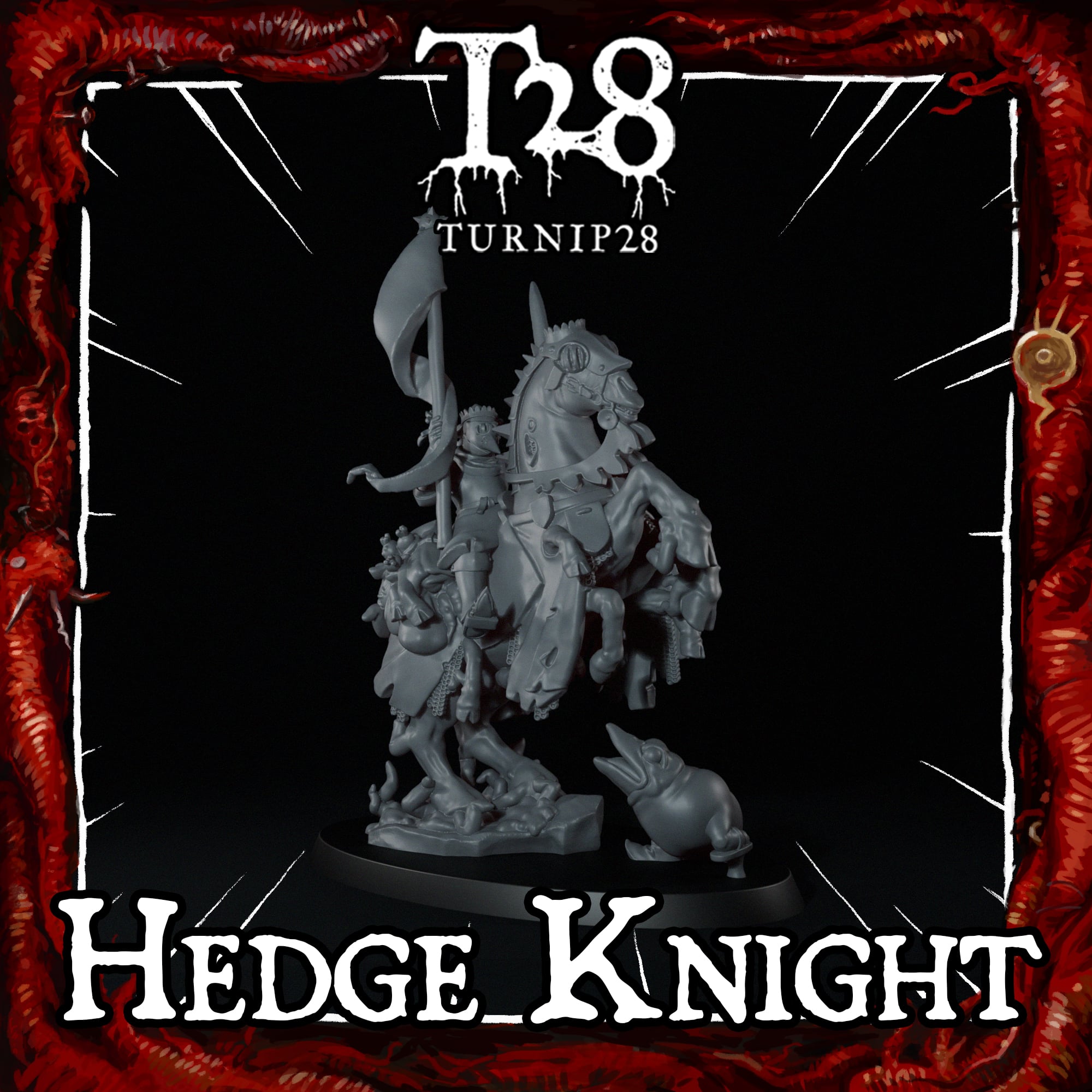 The Turnip28 Hedge Knight comes with 3 Heraldic head options, a choice of weapons and one pfidious Questing Beast.